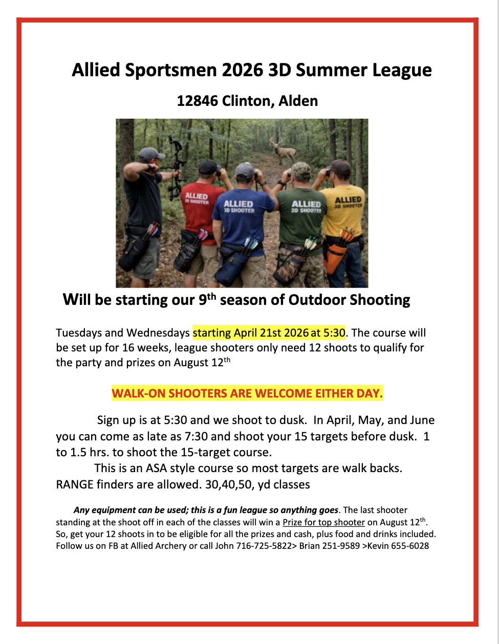 The eastern section of our 38-acre property provides excellent natural features for the ever-changing setups for our outdoor 3-D course. We have a summer league (Tuesday and Wednesday nights) that typically runs April through August. Walk on shooters are welcome. In September, we host a 15-target all deer shoot as a warmup for the upcoming archery season. We also have an outdoor practice shelter and target butts set from 10 to 50 yards. We also host an ASA 20-target qualifying shoot in the spring.